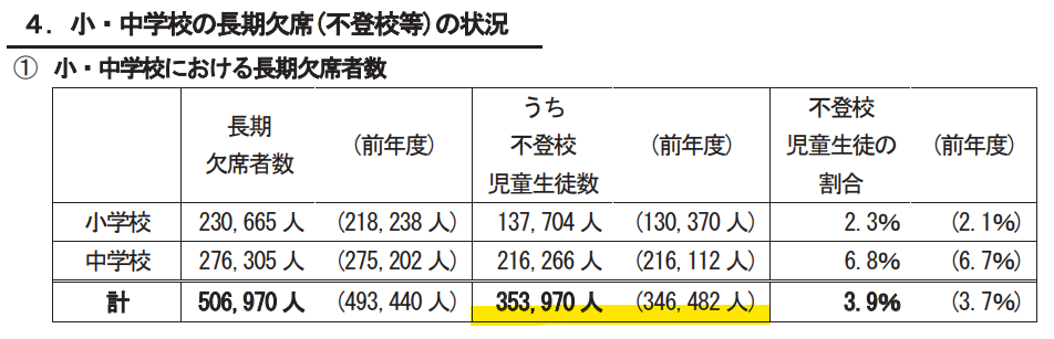 2025年12月現在、小中学校の不登校の子どもは全国で353970人もいるそうです。2024年度から2.2%増えて、12年連続で増加したとのことです。